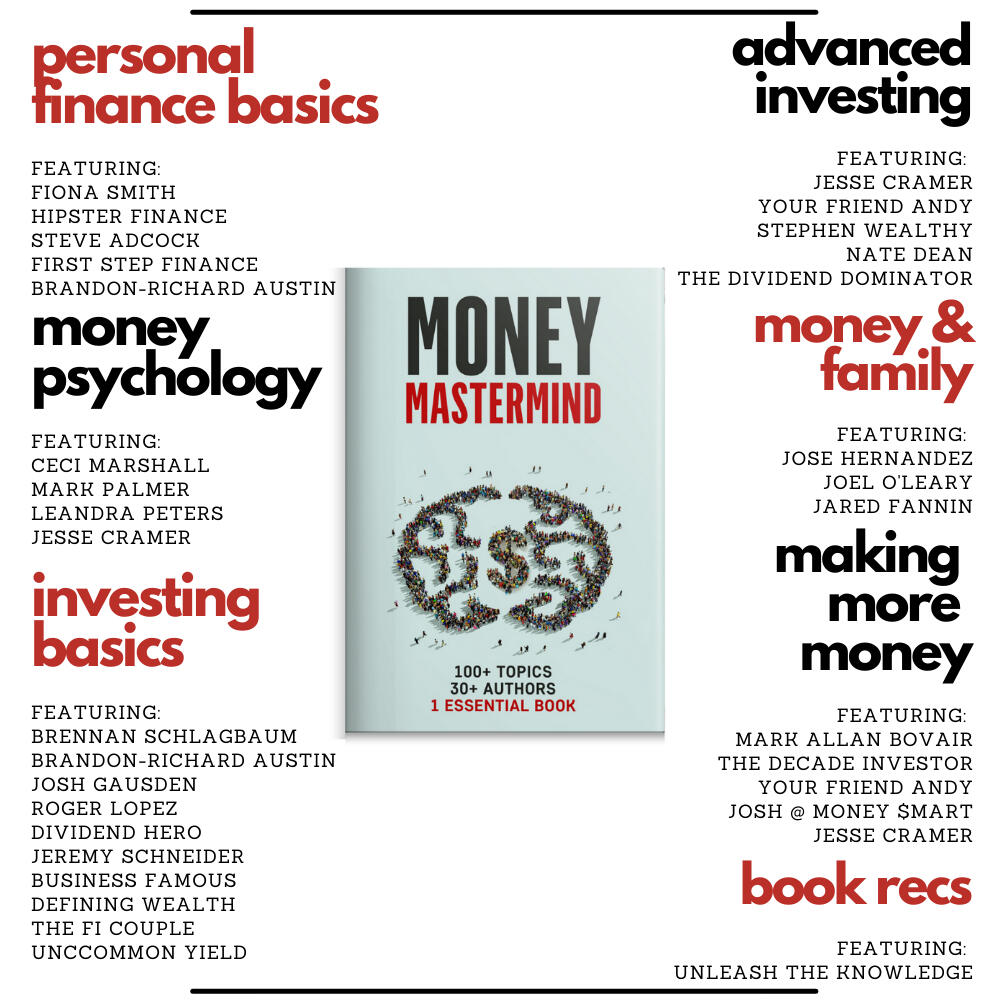 Money Mastermind was created by 30+ experts, with a combined social following of over 1.5 million people! They have a proven ability to bring financial education to their audiences.You can start building your net worth TODAY with our investing steps, our side hustle ideas, and our budgeting advice.Simply buy a copy of Money Mastermind, pick a chapter - any chapter! - and begin your journey.The book covers 100+ topics, from simple to complexWith one mission in mind:
